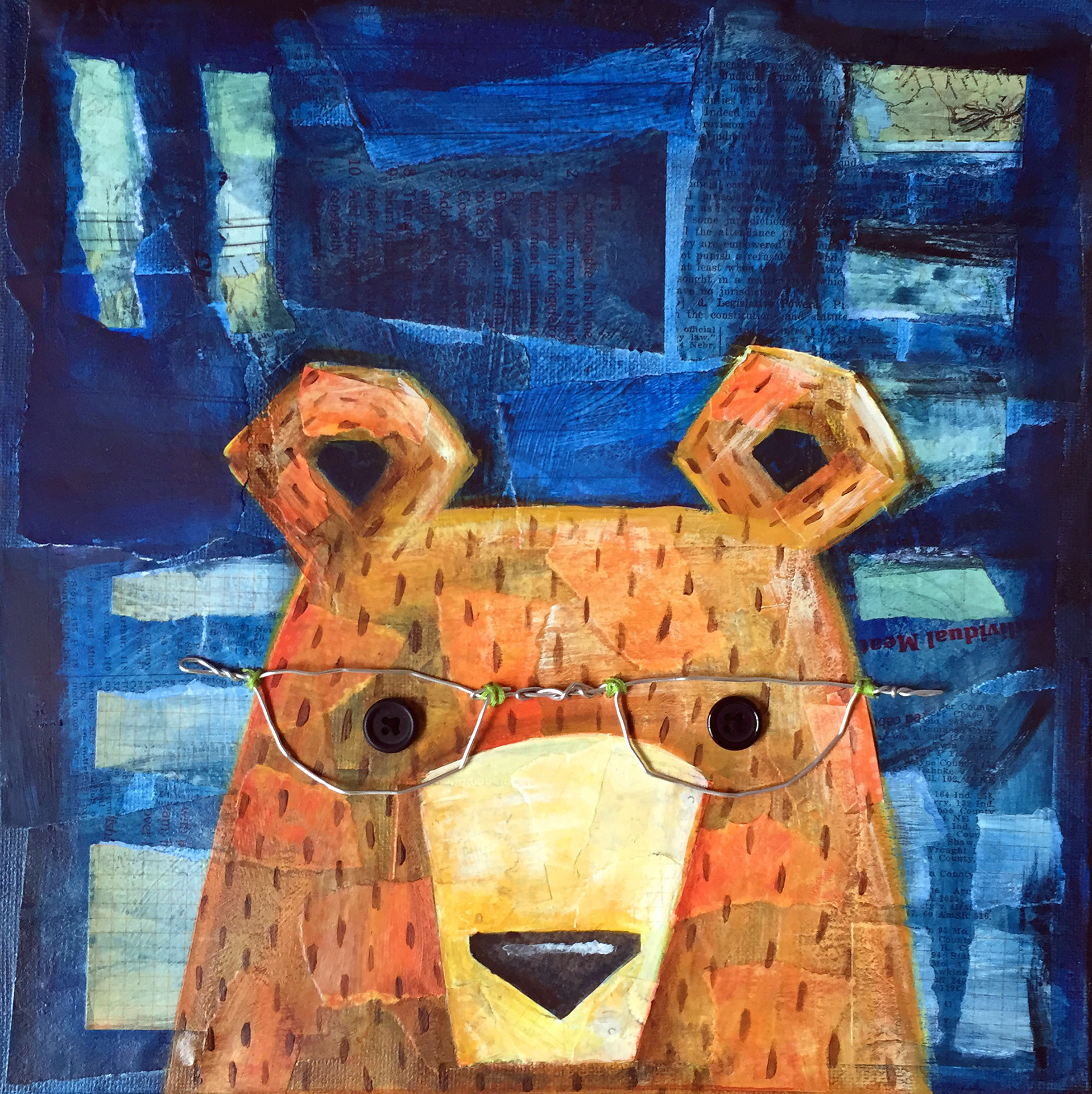Mixed media painting using collaged paper, book pages, buttons, acrylic paint, wire, and thread.