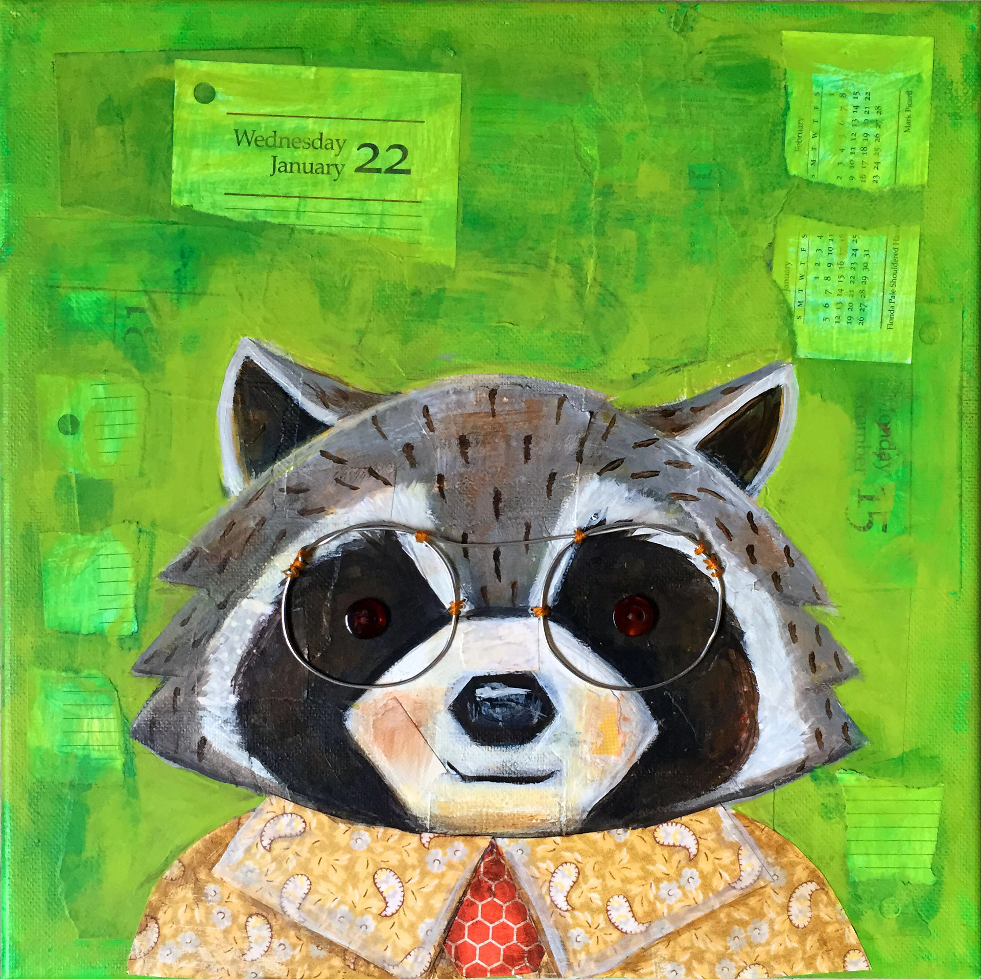 Mixed media painting using collaged paper, book pages, acrylic paint, wire, buttons, embroidery thread