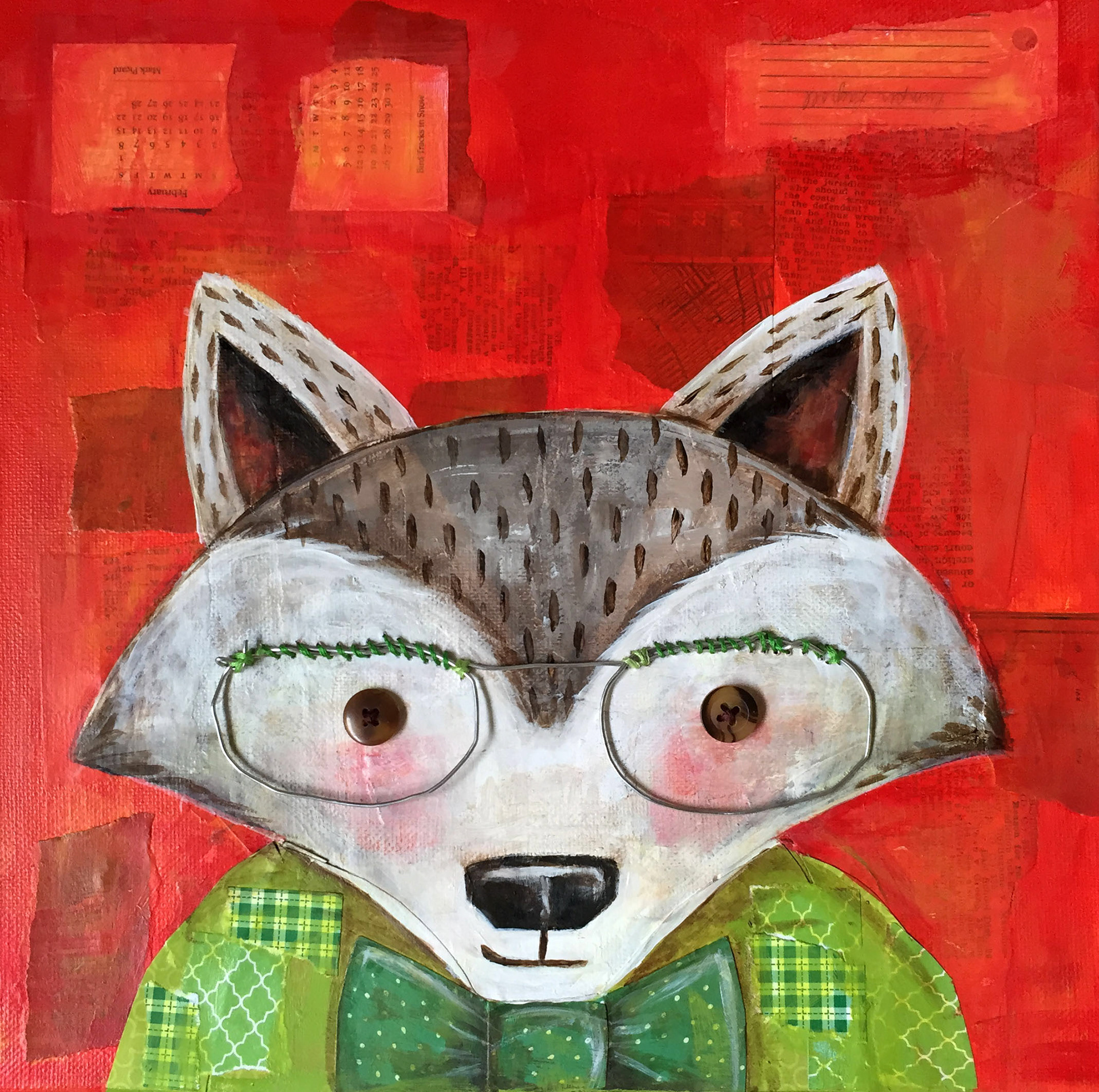 Mixed media painting created with collaged paper and book pages, acrylic paint, buttons, wire, and embroidery thread.